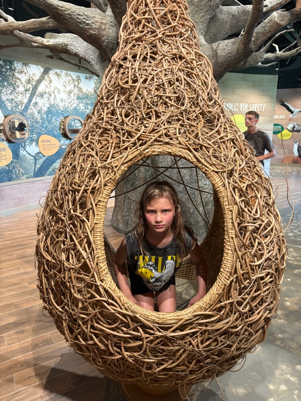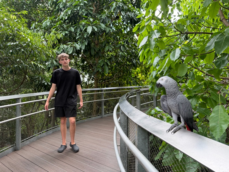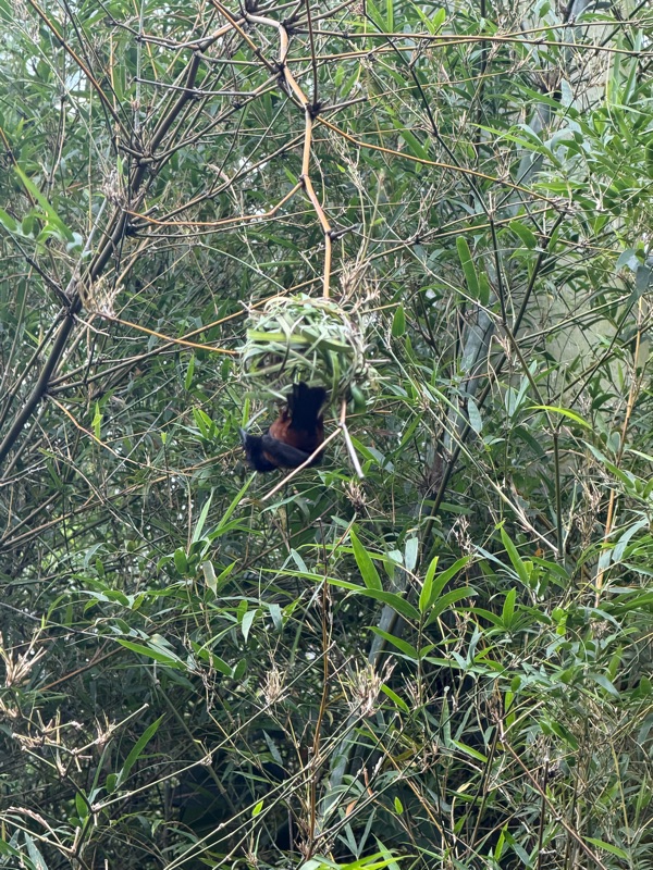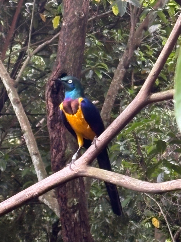 Mikaya is a peacock. 🦚 We saw lots of spectacularly colourful birds or paradise, as well as some gray parrots. Marc wanted to bring home an African gray parrot when we were in Uganda 20 years ago. Thankfully I convinced him not to as we would be looking after it longer than our children. 😛 We also saw some birds in action (a type of weaver bird) constructing their nests. They would fly around and grab a piece of grass and then expertly and quickly weave it into the other part of the nest. So interesting to watch!