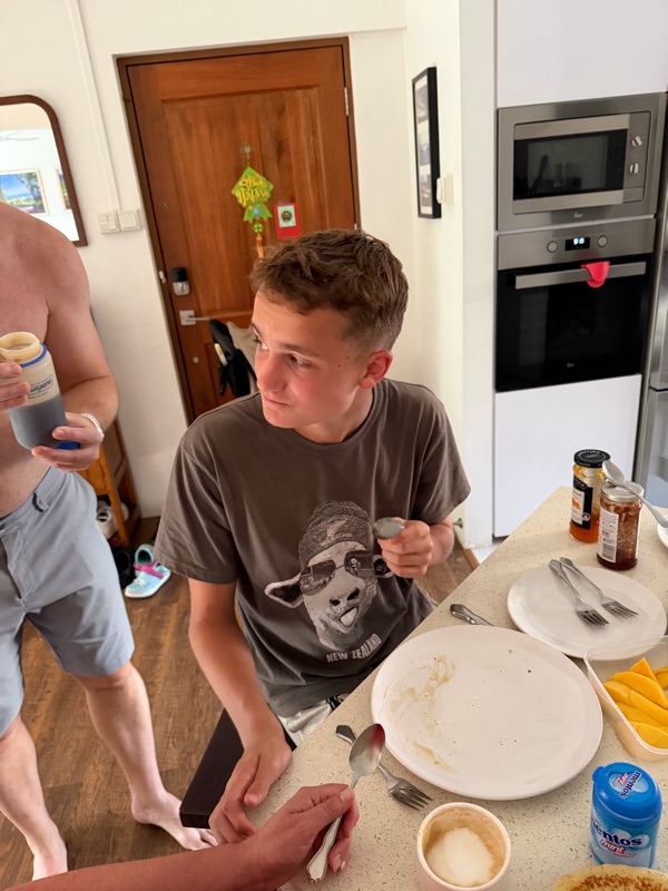 For our final full day in Singapore Aaron made us pancakes and let us sample the legendary Sparks maple syrup imported from New York City (New York City??!!)